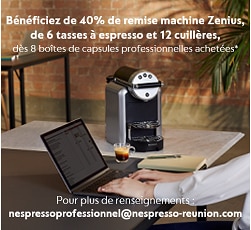 *Offre valable du 08/04 au 31/05/2026 inclus auprès d’un commercial Nespresso Professionnel Réunion par email à nespressoprofessionnel@nespresso-reunion.com, réservée uniquement aux nouveaux Membres dont le numéro de Siren est enregistré à l’île de La Réunion. Pour tout achat d’une machine Zenius et de 8 boîtes de capsules professionnelles, soit 400 capsules achetées, bénéficiez de 40% de remise sur le prix de la machine Zenius, 6 tasses View espresso et 12 cuillères offertes. Soit un montant total d’une valeur de 469,05€ ttc minimum. L’éco-participation de 0,22€ ttc n’est pas remisée. Offre valable selon le stock disponible, uniquement sur le modèle Zenius, non cumulable avec toute autre offre Nespresso en cours. Suggestion de présentation. Visuels non contractuels.